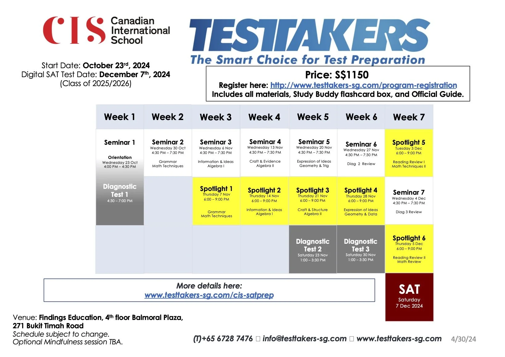 At the request of the Canadian International School, Testtakers Singapore, a local company specializing in SAT preparation, will be offering an SAT preparation program for year 11 and 12 students. This program will be held at the Testtakers facility at Balmoral Plaza leading to the December 7th test date. This program will cover all aspects of the new-format dSAT as well as provide general information on the American university application process.