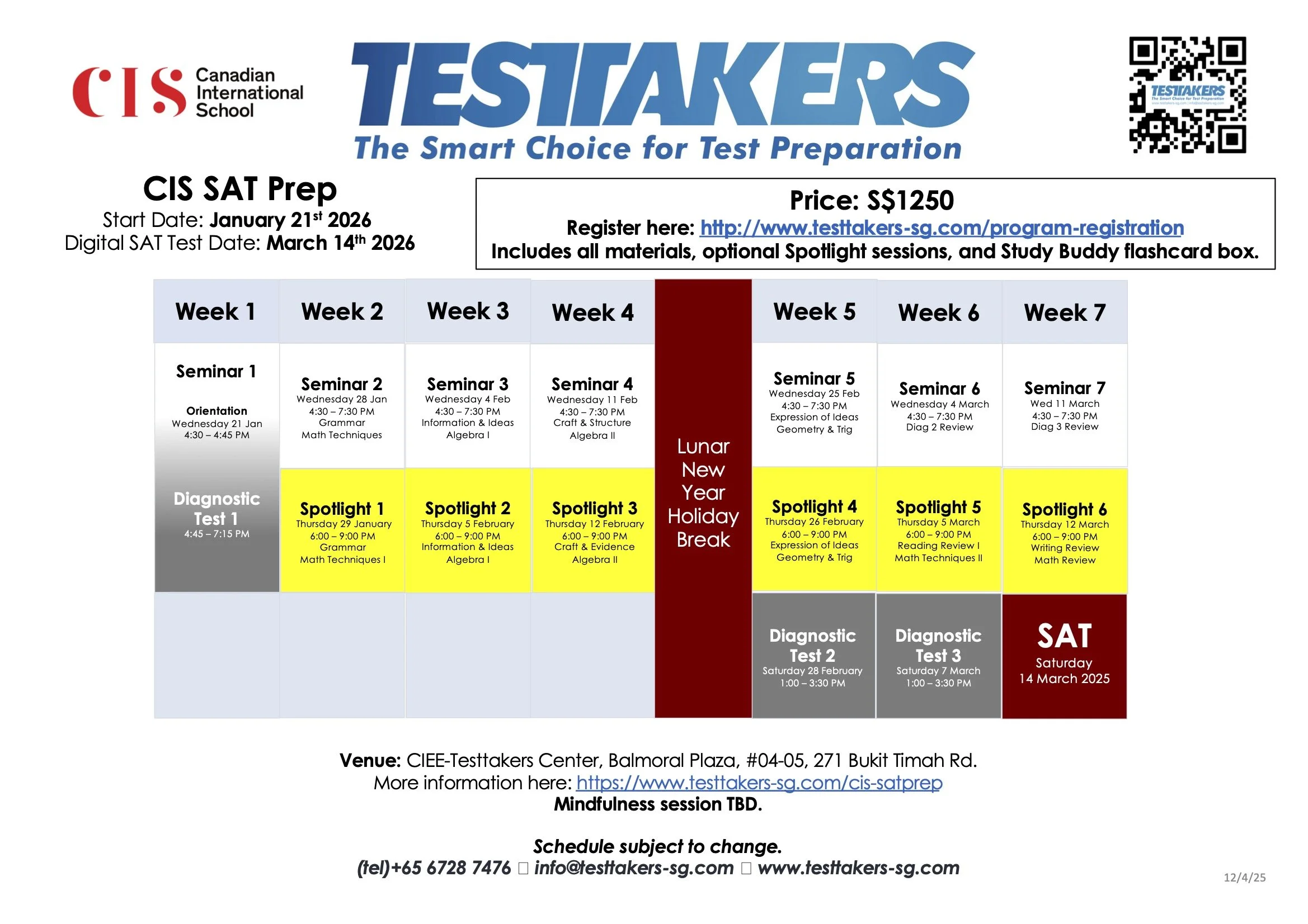 At the request of the Canadian International School, Testtakers Singapore, a local company specializing in SAT preparation, will be offering an SAT preparation program for year 11 and 12 students. This program will be held at the Testtakers facility at Balmoral Plaza leading to the March 14th test date. This program will cover all aspects of the new-format SAT as well as provide general information on the American university application process.