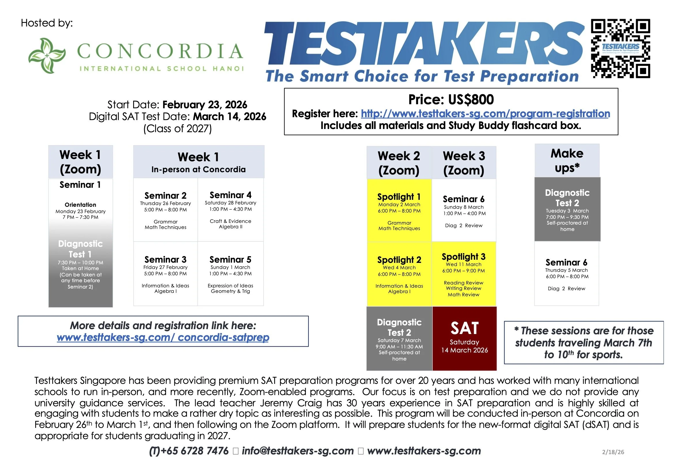 Testtakers is making its well-established, in-person SAT preparation program available to Concordia students for the second time. The program will be delivered in-person at Concordia from February 26th to March 1st, and then via the Zoom platform leading to the March 14th SAT test date. Please find the full schedule below.
