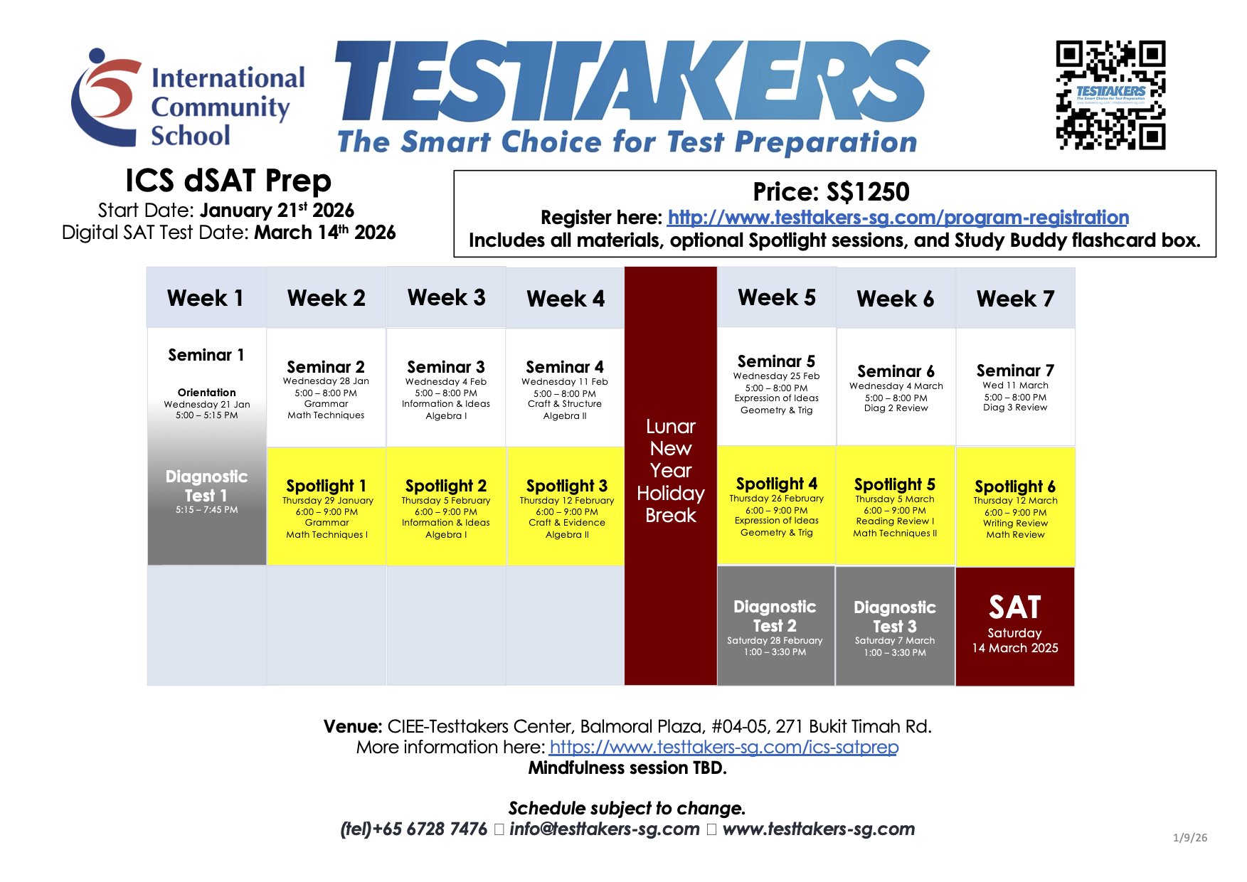 At the request of the International Community School, Testtakers Singapore, a local company specializing in SAT preparation, will be offering an SAT preparation program for year 11 and 12 students. This program will be held at the Testtakers facility at Balmoral Plaza leading to the March14th test date. This program will cover all aspects of the new-format dSAT as well as provide general information on the American university application process.