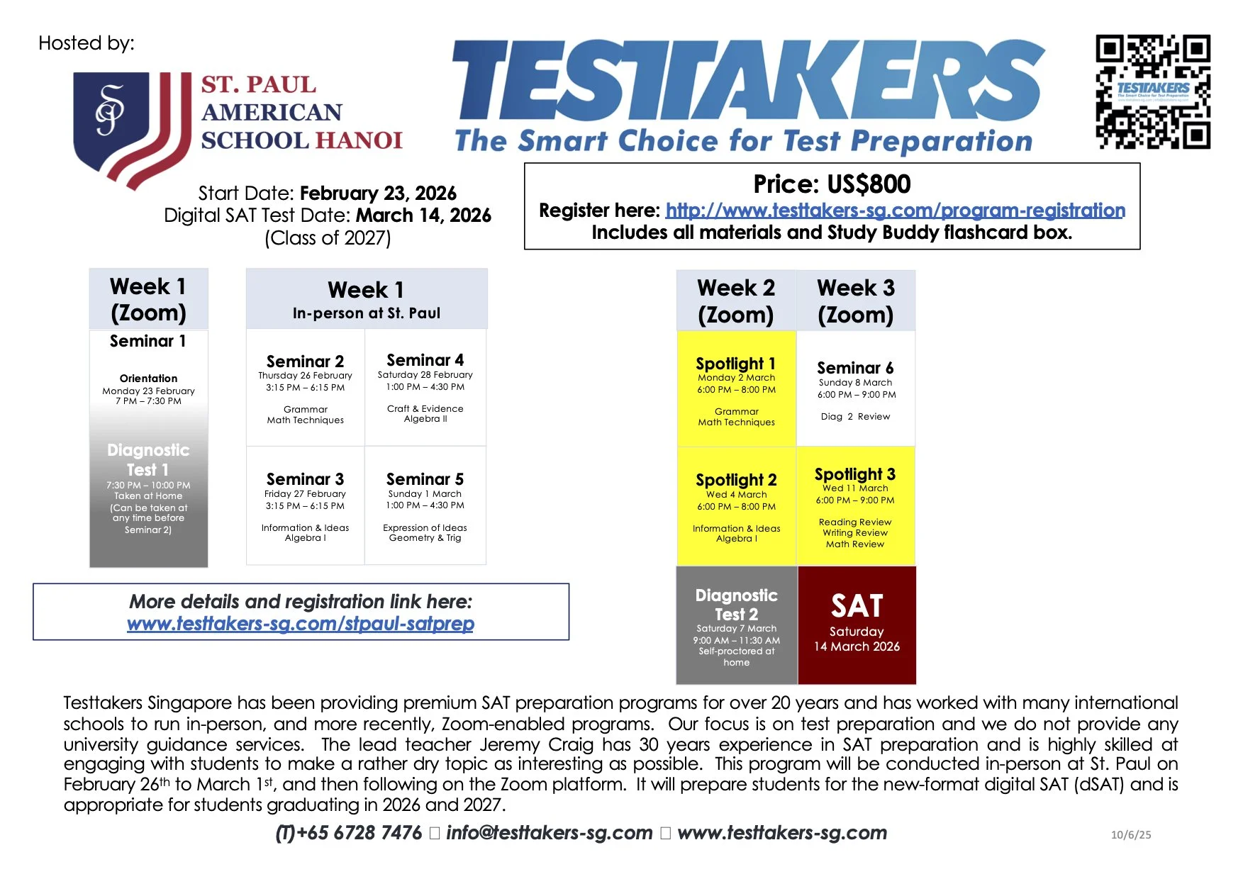 Testtakers is bringing its well-established, in-person SAT preparation program available to St. Paul American School. The program will be delivered in-person at St. Paul from February 26th to March 1st, and then via the Zoom platform leading to the March 14th, 2026 SAT test date. Please find the full schedule below.