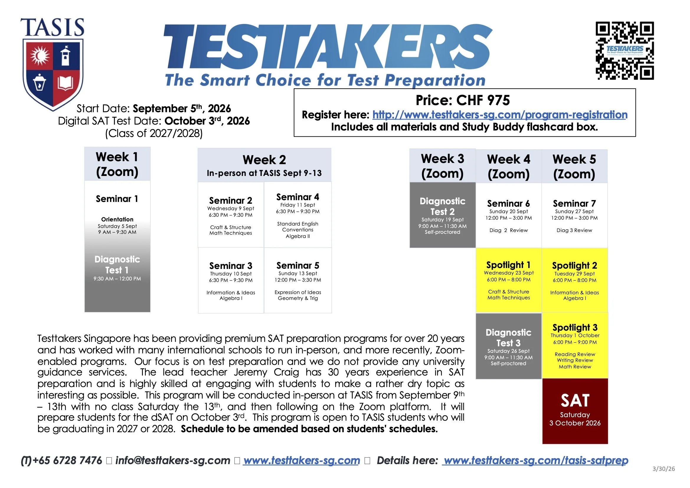 Testtakers is making its well-established SAT preparation program available to TASIS students for the sixth time. The program will be delivered in-person at TASIS from September 9th to 13th, and then via the Zoom platform leading to the October 3rd SAT test date. Please find the full schedule below.