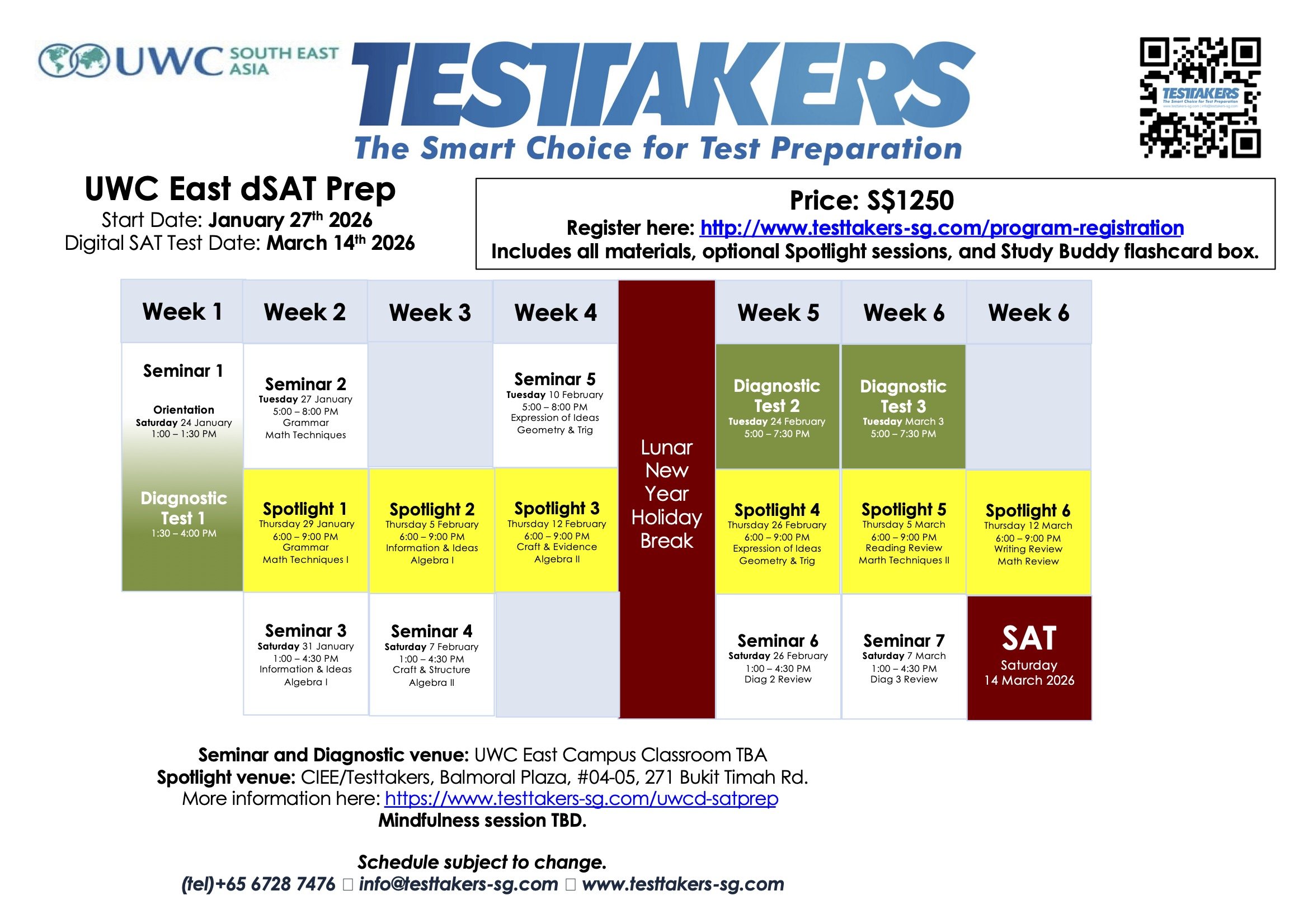 Testtakers Singapore, a local company specializing in premium test preparation, will be offering an SAT preparation program on the UWCSEA East campus leading to the March 14th digital SAT (dSAT) test date. This program is appropriate for students in the class of 2027. Note that the program will prepare students for the new format digital SAT taken on a computer in a proctored environment. The full schedule is below and the total course fee is S$1250, covering all materials. Note that students need to register themselves for the actual SAT test, we can’t do that for you.